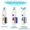 • Filter 1 -> Stage 1+2 - Polypropylene (PP) sediment + Activated Carbon Block with Anti-Scale pre-filter - extracts suspended materials such as sediment, rust, insects, and other particles. High purity coconut shell activated carbon block filter reduces sediments, taste, odor, color, SOCs (soluble organic compounds) like pesticides, dioxins, and VOCs (volatile organic compounds) like chloroform and petrochemicals. The anti-scale material prevents blockages in RO membrane, thus extending its life. (Change every 6 months)